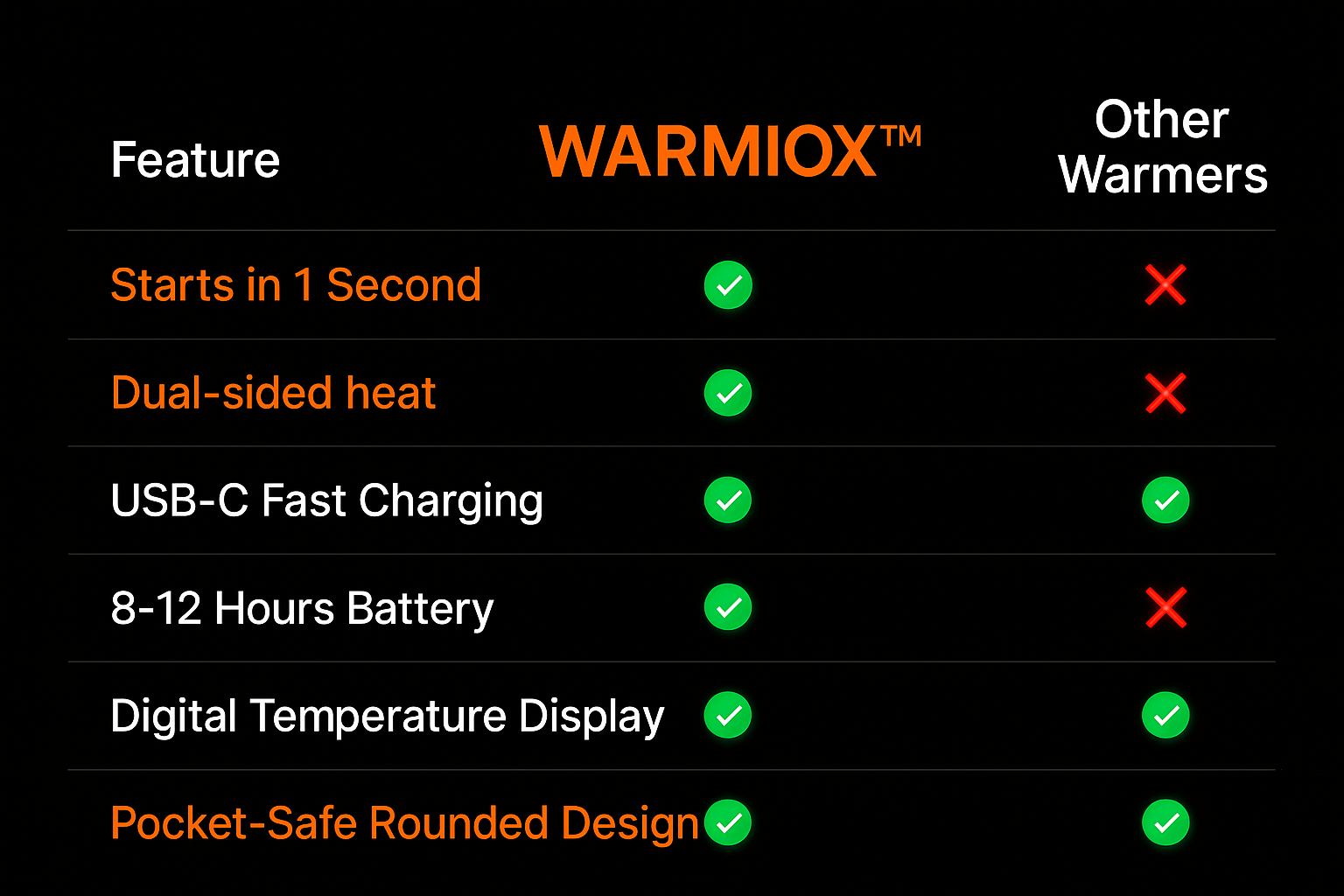 Say goodbye to freezing hands. WARMIOX™ delivers rapid, adjustable heat in seconds — perfect for winter commutes, outdoor work, dog walks, sports events, and icy Canadian & US mornings.